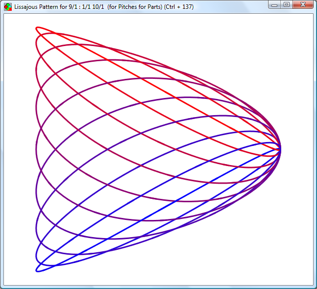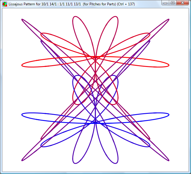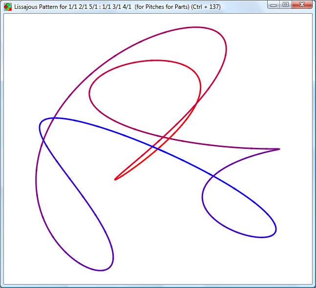 Added a new option in the Lissajous Pattern Options window (More twice version of it): "Display frequencies alternately horizontally and vertically (so show 1st note played horizontal, 2nd note vertical, ...) rather than by pan position". This gives many ways to display the same chord depending on the order you play the notes. E.g. play 1/1 5/4 3/2 or 1/1 3/2 5/4 in that order and you get a different Lissajous pattern.
